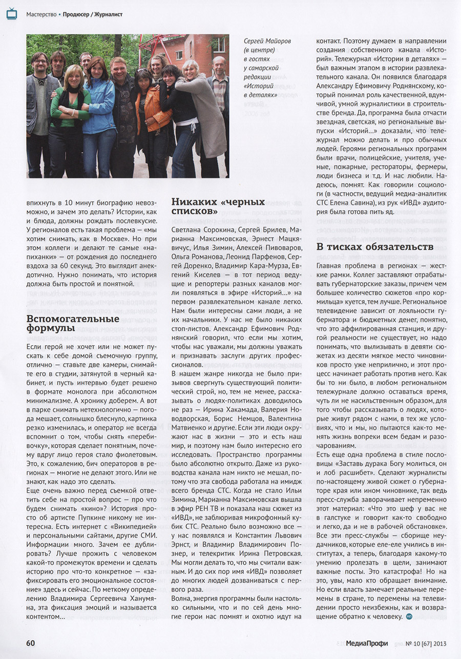 Тележурнал «ИСТОРИИ В ДЕТАЛЯХ» был уникален не только тем, что просуществовал на рынке семь сезонов подряд, удерживая рейтинги СТС в своем слоте. Его создателю СЕРГЕЮ МАЙОРОВУ удалось превратить «ИСТОРИИ...» в формат и подготовить с десяток журналистских коллективов.