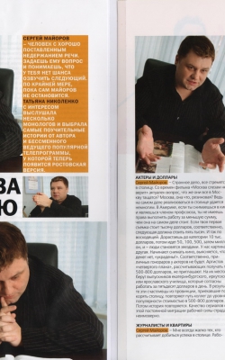 Сергей Майоров - Странное дело, все стремятся в столицу. Со времен фильма «Москва слезам не верит» актуален вопрос, что же они все в Москву тащатся? Москва, она что, резиновая? Ведь на самом деле реализоваться в столице удается немногим. В Америке, если ты снимаешься в кино и являешься членом профсоюза, ты не имеешь права выполнять работу за меньшую сумму, чем она на самом деле стоит. Если твоя первая съемка стоит тысячу долларов, соответственно, следующая должна стоить пять тысяч. И так по восходящей. Дорастаешь до категории 10 тыс. долларов, потом идет 50, 100, 500, затем миллион, и - люди становятся звездами. У нас картина другая. Начинают снимать кино, выясняется, что денег нет, «украдены!». Соответственно, приличных гонораров у актеров не будет. Артистов «четвертого плана», рассчитывающих получать по 500-800 долларов, не приглашают. На их место берут выпускников екатеринбургского, иркутского или ярославского училища, которые согласны работать за пятьдесят долларов в день. В результате эти счастливцы из провинции, приехавшие покорять столицу, повторяют путь коллег до уровня популярности стоимостью в 500-800 долларов. Потом история повторяется. Качество сериалов от этой постоянной миграции рабочей силы страдает неимоверно.